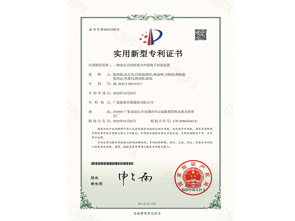 一種改良式鋁材廢水中鋁離子回收裝置實(shí)用新型專利證書